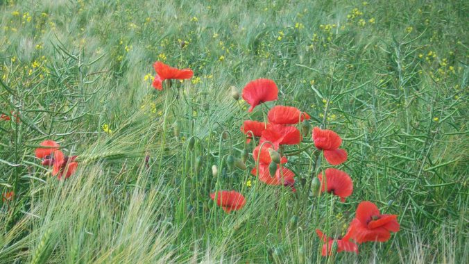 There was lots of ground to cover across country lanes and wide grassy tracks.  I loved the wheat fields, splashes of poppies, bright rapeseed fields, and other crops growing around us.  We continued to spot different breeds of cows and sheep, as well as today’s animal highlight, horses, Lots of them.  Unlike the pea-brained sheep, when they saw us coming they all ran to the fence to greet us and watch us with an intelligent curiosity.  I wish I had been able to capture the sight as about 30 horses galloped together to the edge of the field.  Here’s my best effort with just a camera: