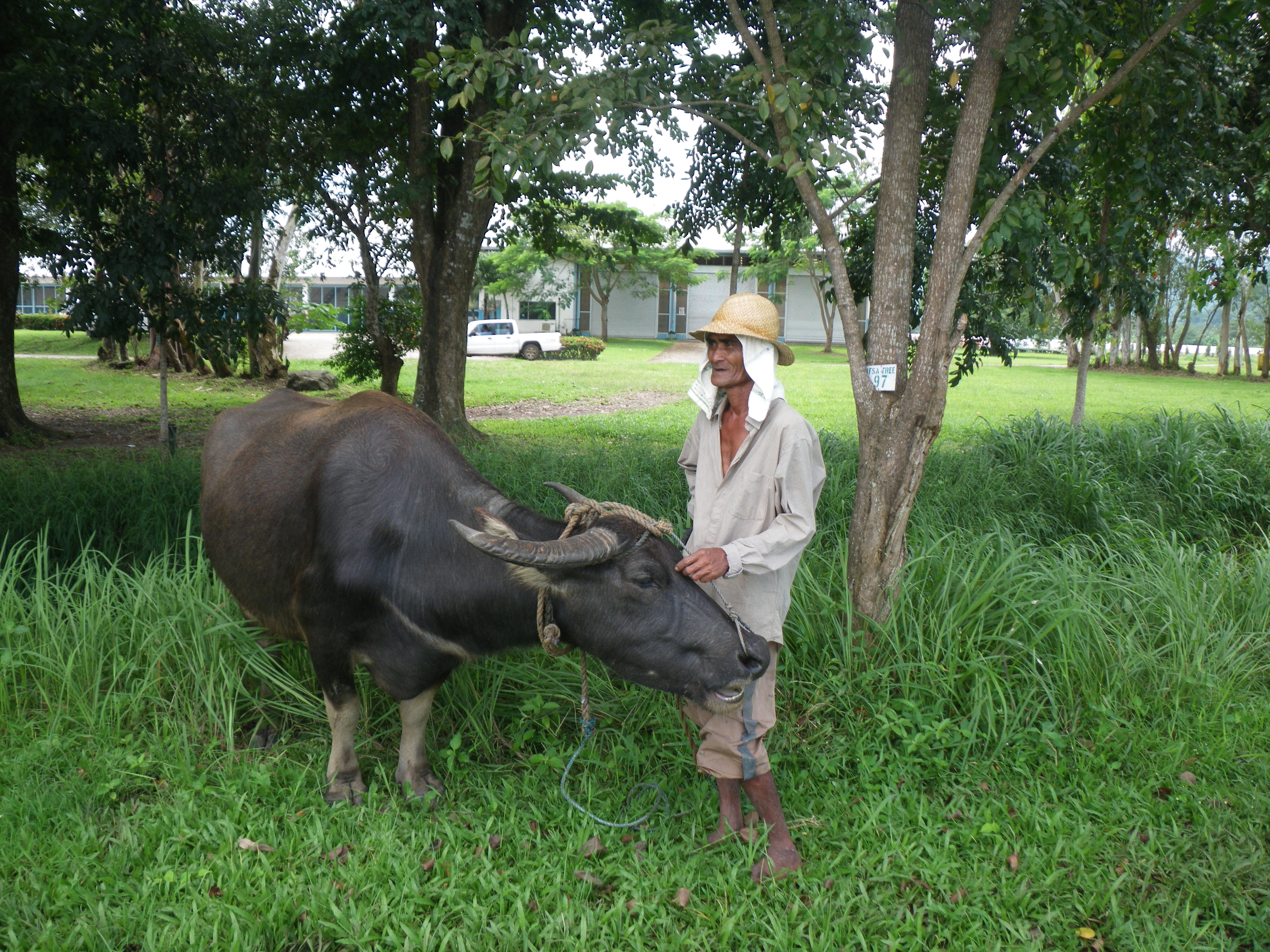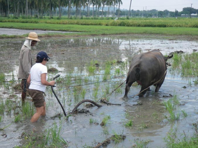The last educational part of the day was a hands-on trip outside to learn about planting and cultivating rice. Our group got to experience pulling a plough behind a carabao, as well as an power cultivator. Others planted rice in the prepared mud. Messy for sure, and a bit hazardous, as the carabao frequently stopped to “fertilize” the mud as he worked….but a lot of fun for those that didn’t mind getting muddy.