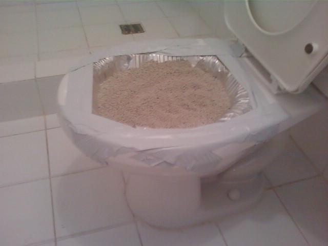 Raise the lower toilet seat and tape a disposable aluminium pan to the inside of the ceramic bowl. It has to be tabled really securely and able to take the weight of the cat, Here’s my first insert:
