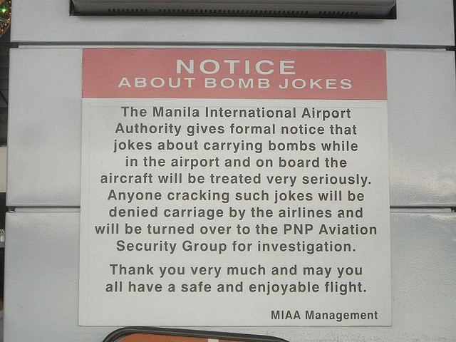 A quick post on the way out of Manila (Jakarta bound)….. I love this. What happened I wonder? Did bomb jokes at the airport become a national obsession with everyone and their granny announcing they had a bomb in their bag? Or did some clown take his gag too far one day? We’ll never know….but I won’t be “cracking such jokes” any time soon!