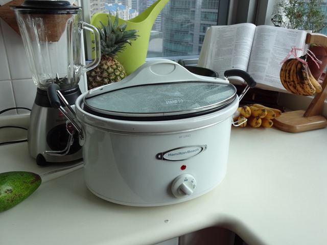 Note our containers are too tall to fit into the crockpot to close the lid properly. This is not a problem if you use a thermometer to keep track of the temperate and a towel to cover the top of the crockpot and act as a blanket. You should try to maintain a temperature of 100 degrees Fahrenheit. The minimum mark on our meat thermometer is 120 degrees, so once we see the temperature is getting near the 120 mark, we turn the crockpot off and let it sit for a couple of hours, keeping an eye on the thermometer and turning the crockpot back on again to bring the temperature up again. This can be much easier if you have a hot area in the house that you know maintains a high temperature, or a crockpot that can maintain 100 degrees by itself. Ours can’t and we are fighting erratic airconditioning in the kitchen. With a little practice your get a feel for how long it takes and how many times you need to check the temperature. Yoghurt making takes 4-8 hrs typically. In the right temperature conditions, you can put it on before you go to bed and wake up to fresh yoghurt.