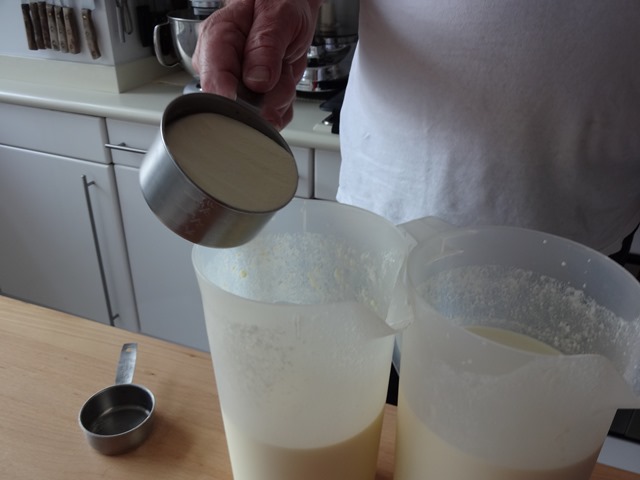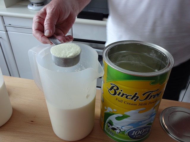 Pour milk(or water) into plastic jugs. Add 2/3 cup of milk powder to each jug and whisk. Add half the yoghurt starter to each jug. Mix well. Finally add the sweet dairy whey to each container and whisk well.We like to use two jugs and pour the liquid back and forth to make sure both jugs have equally combined ingredients.