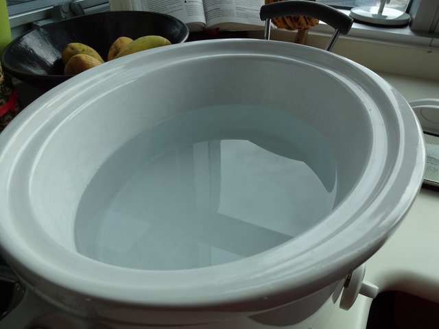 Put the yoghurt containers and baggie into the crockpot. The crockpot should be no more than 1/3 full of warm water.