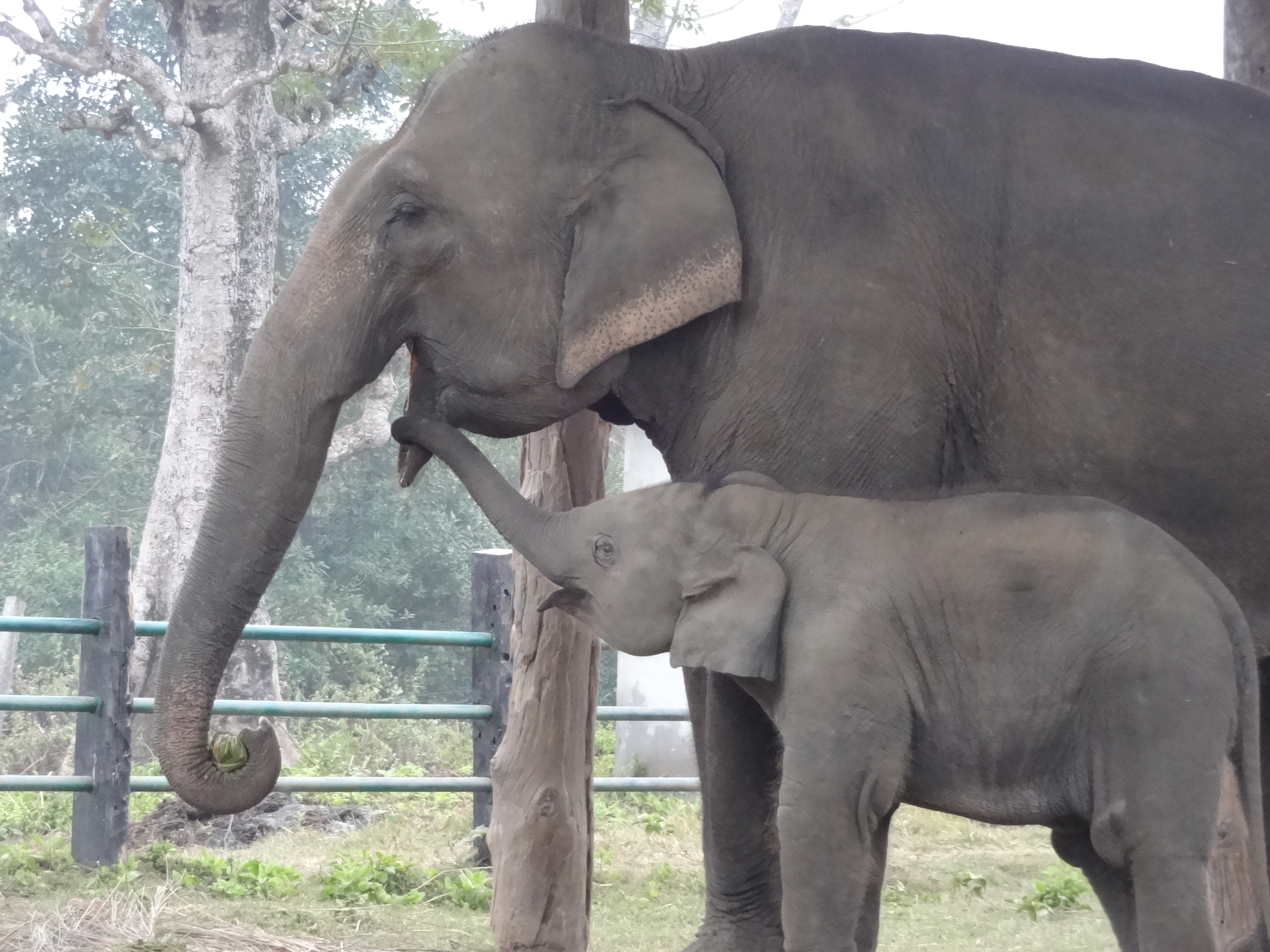 After the kids were dried off and rested, we headed out to see the last elephant activity of the day: the elephant breeding center. This is a government-run enterprise that breeds captive female elephants with wild males. The babies are reared at the center and the resident elephants are put to use maintaining the park and preventing poaching. (These aren’t the same elephants that take tourists on rides.) The working elephants spend their days out in the jungle and then return to the center in the afternoon. Here they are chained and fed, and spend the night with the babies.