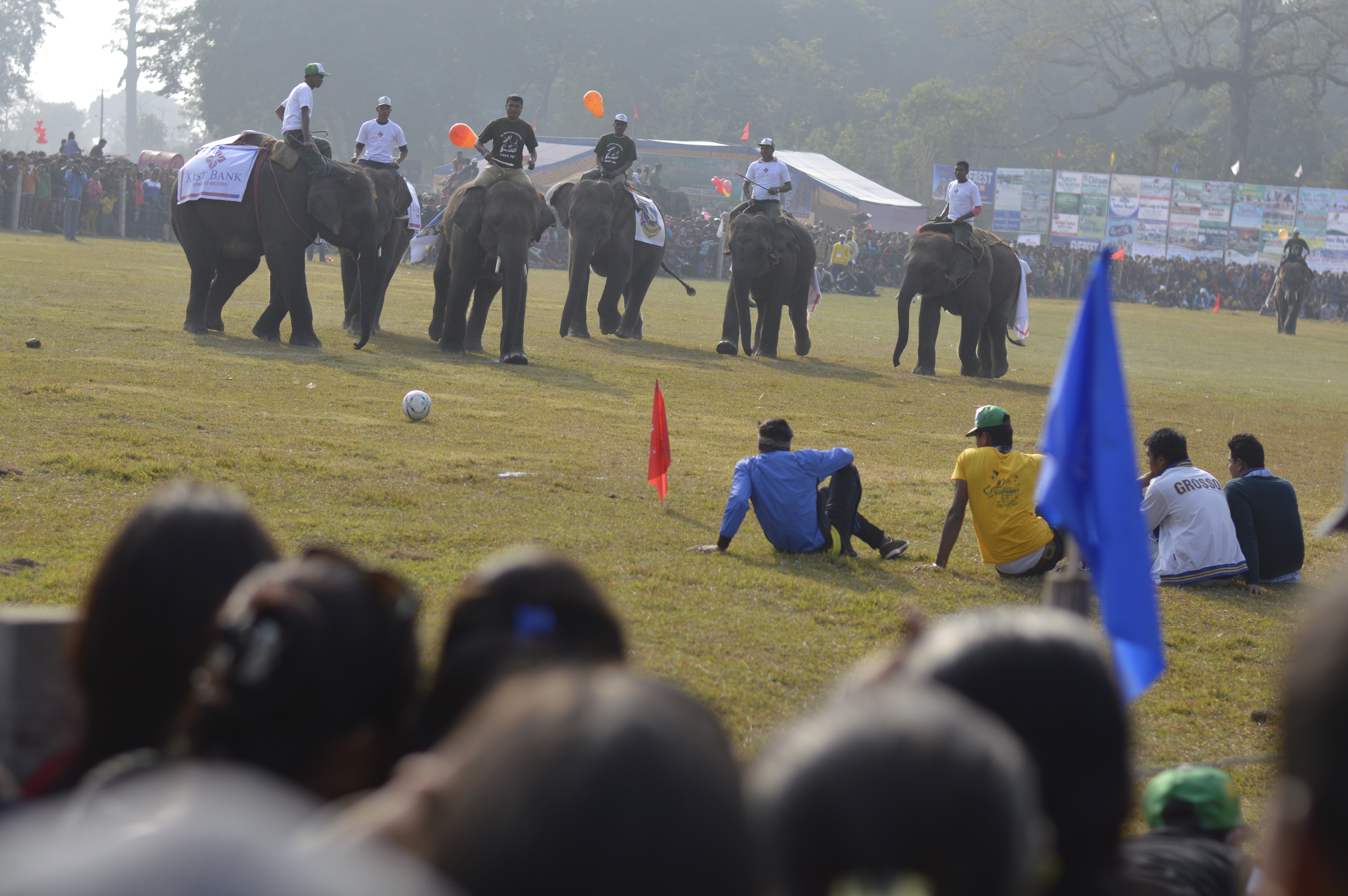 Pushing onward through the stalls on the ground, we headed diagonally over to the elephant soccer game. This wasn’t elephant polo — which I had heard of in Chitwan — but a football game. I think elephant soccer was actually cooler as the elephants kick the ball or whip it with their trunk. There’s even an elephant goalie. They looked like they were enjoying themselves.