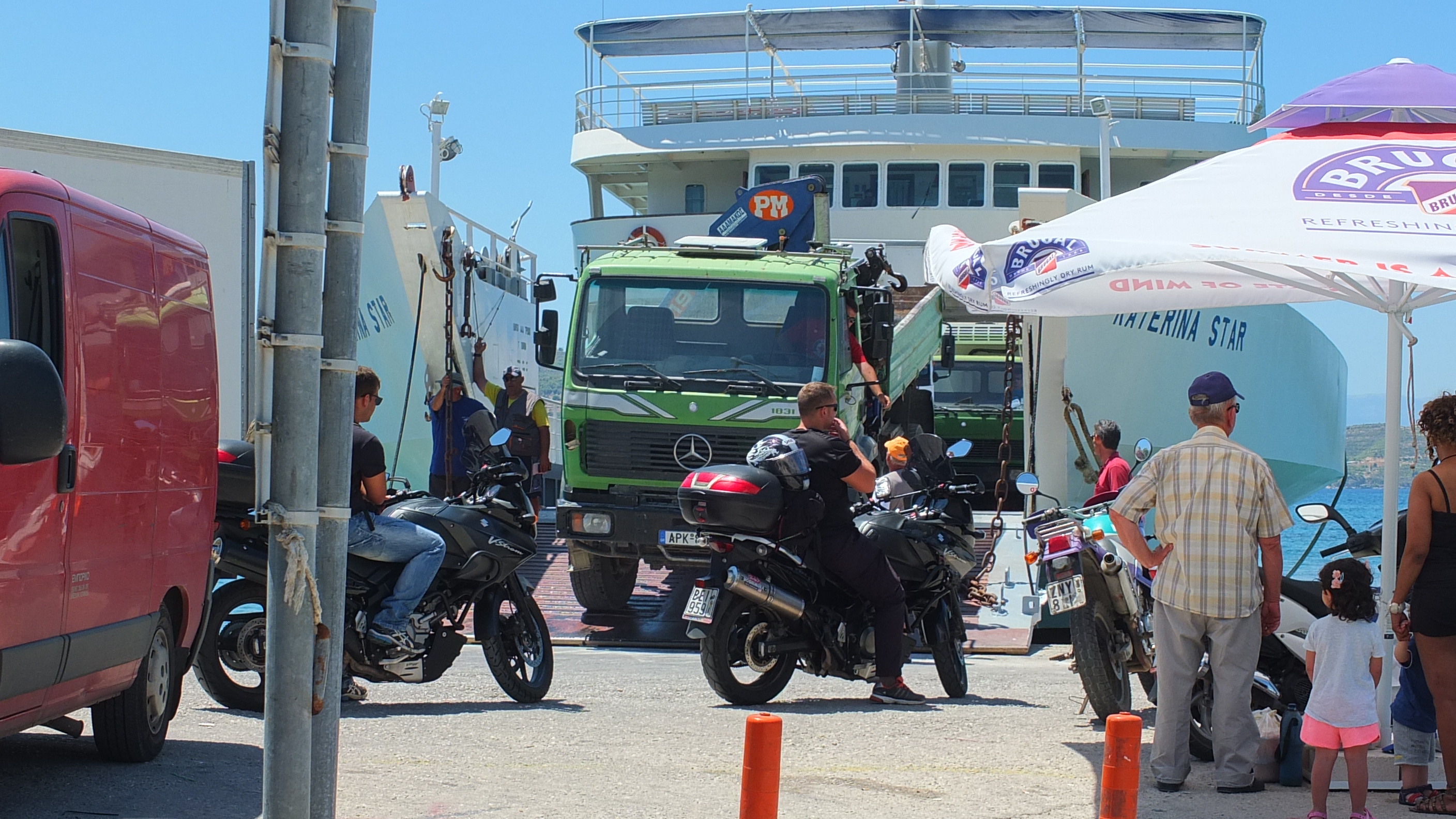 As this blog (and its owner) continues to take a much needed hiatus from all things Nepali, I thought I’d focus on Greek transportation for this week’s challenge. In particular the local ferry, which is a much needed lifeline between our island and the mainland, carrying produce, meat and dairy in refrigerated trucks as well as building supplies, gasoline– – you name it — to the local economy.
