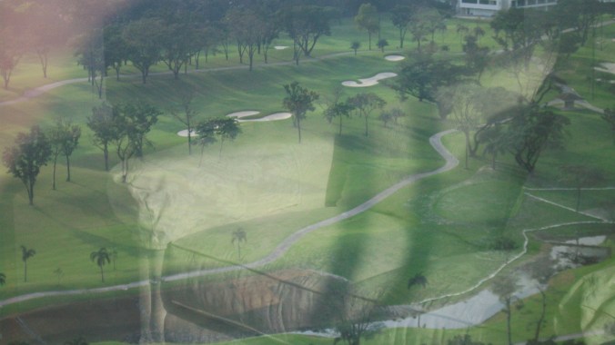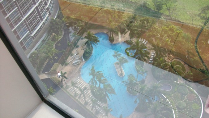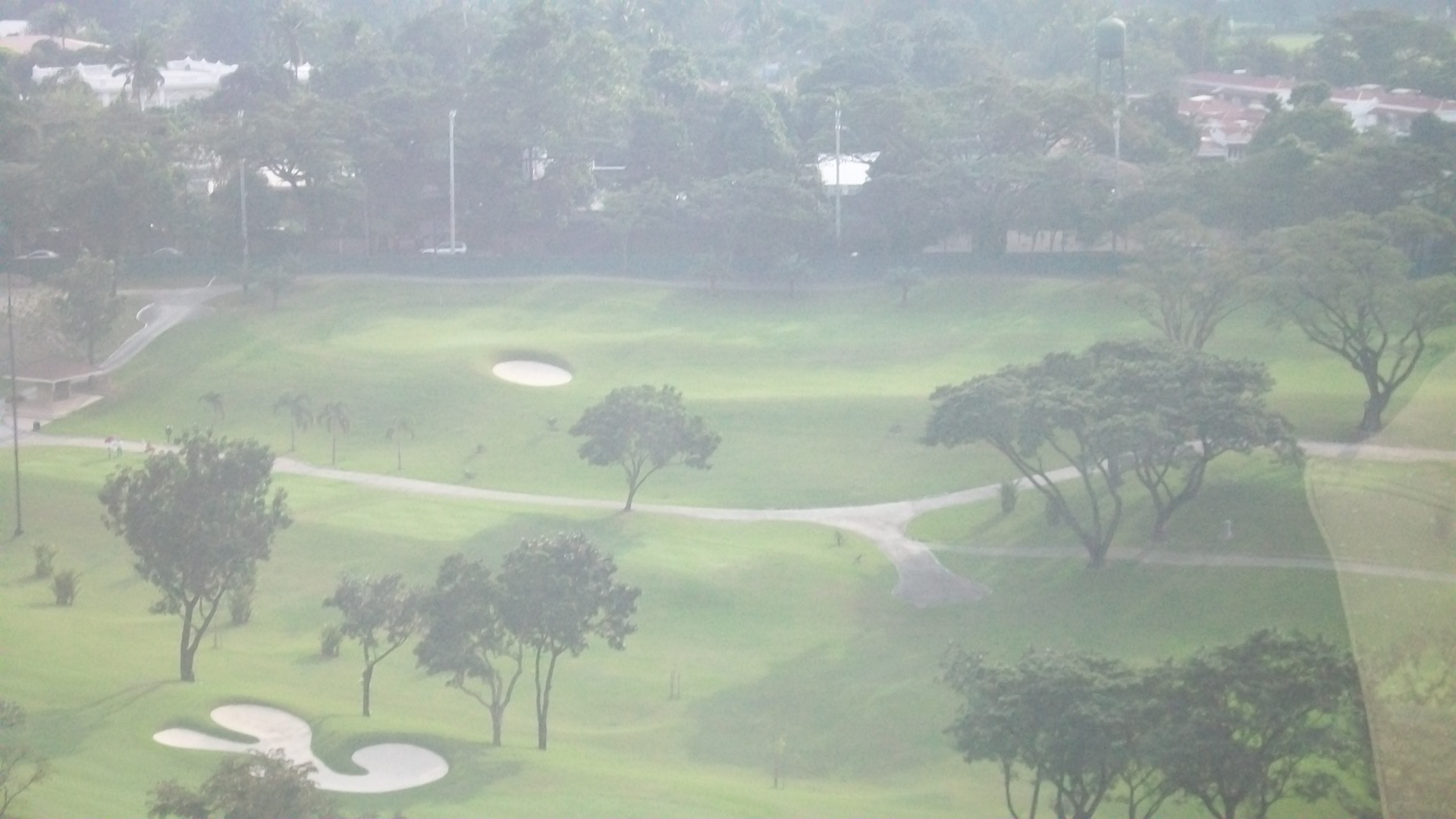 Sitting on the sofa and looking out, the golf course takes up a lot of the closer view. The large very attractive pool is down below on the left. To the right, the towers of the financial district (Makati). You can also see the sea in the far middle horizon, but the camera can’t pick up that detail: