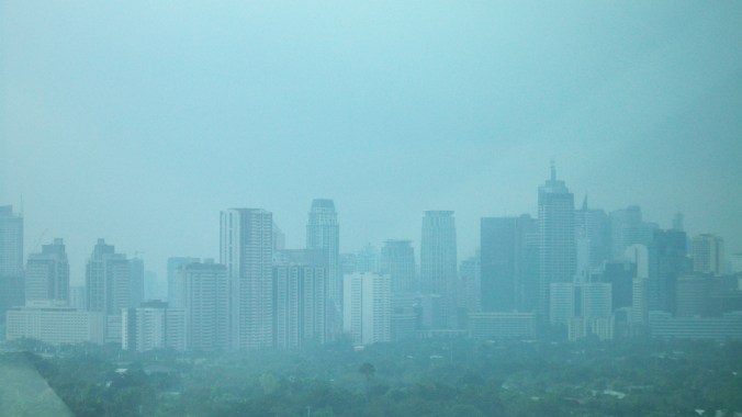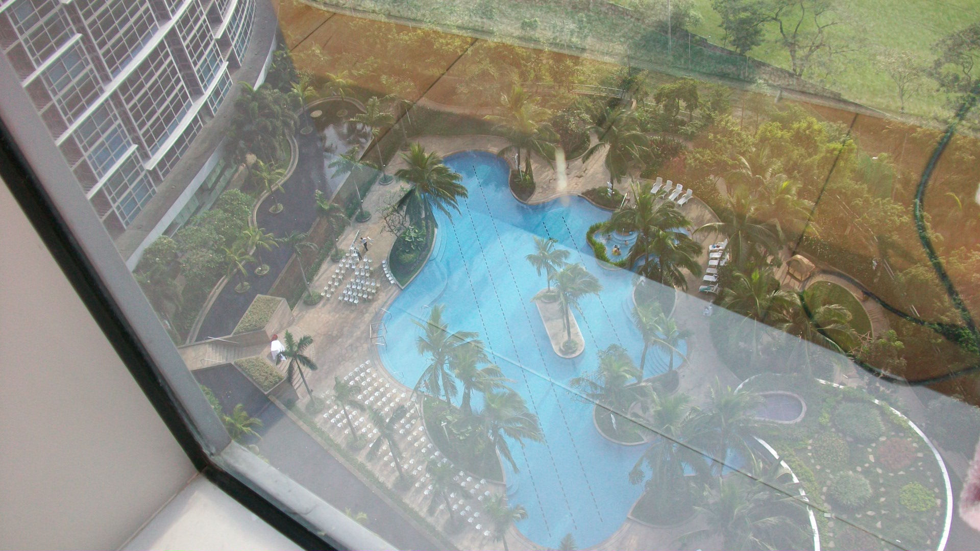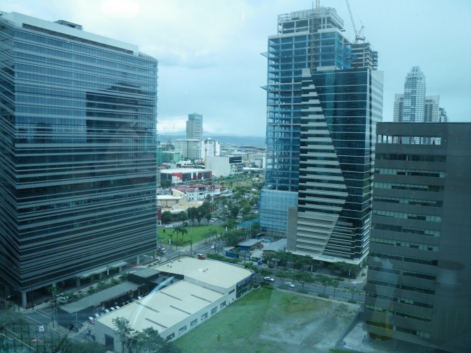 Its Christmas Eve and we went out for a walk in around Fort Bonafacio, our area of Manila. Then came back and had a swim in the pool. Its cool (for Manila) – only about 75 degrees today I would guess, but still pretty humid. Lots of smog too. Here are some first pics from our apartment windows. I tried to take a few long and closer shots to give a sense of perspective. The fuzziness you see are a mixture of the smog, photographing through tinted windows and the reflection of the glass…so sorry for the quality…but it should give you some idea: