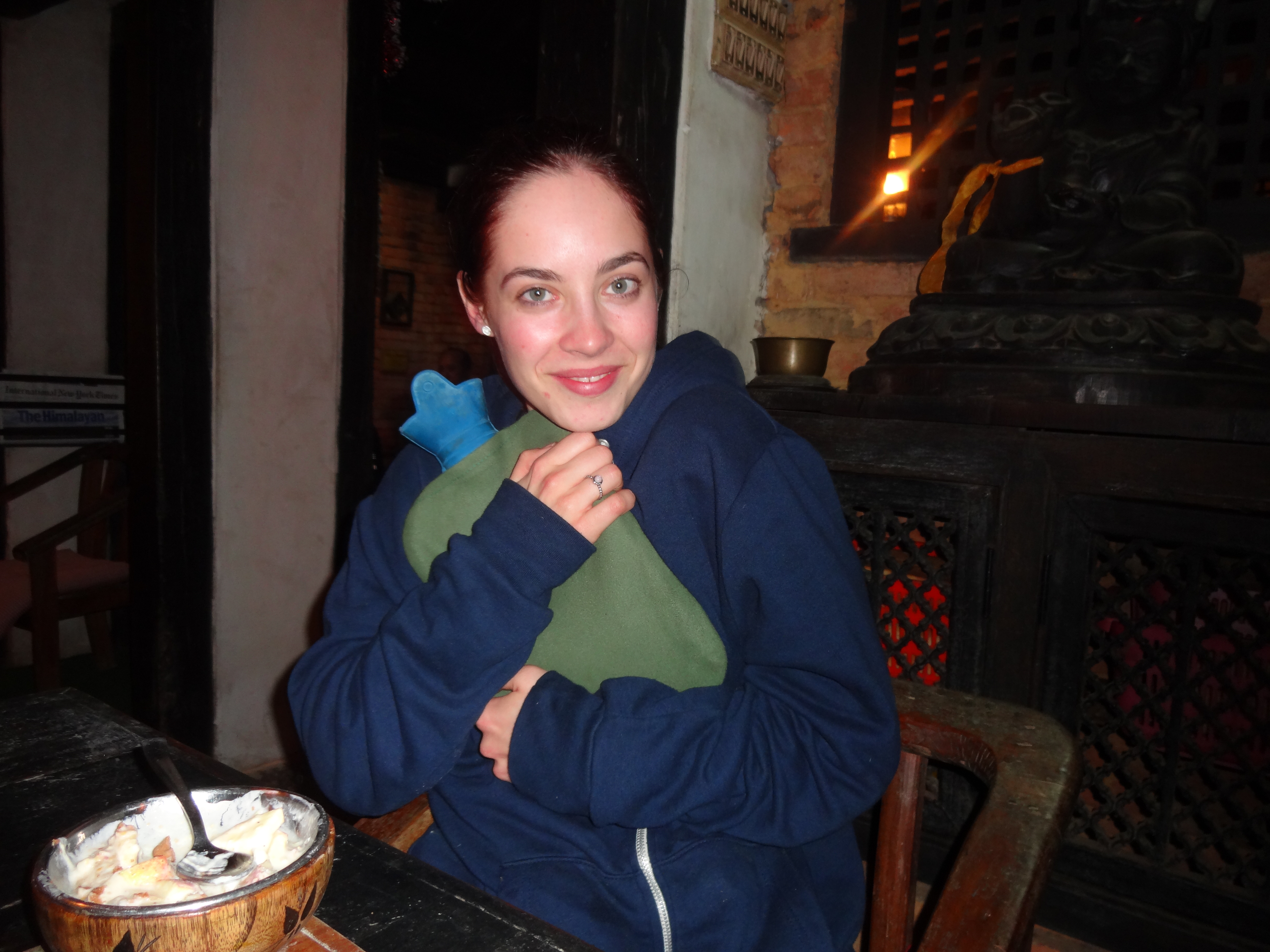 We debated different restaurant options for dinner, but through acquiescence found ourselves eating the set menu at the inn. The power was still off and the entire restaurant was heated and lit only by the smoky fireplace place, lamps and candles. It was now getting pretty cold and we sat in the restaurant bundled up in jackets and scarves sipping wine and soaking in the atmosphere. Unprompted they brought us bowls of good, hot tomato soup which we devoured to warm us up. This heralded the start of the dinner service and a buffet was slowly set up behind us: Piping hot roast chicken, gravy, mashed potatoes, cauliflower cheese and vegetables. Served on stone cold (room temperature) plates, the food soon turned cold as we ate, but it was surprisingly good. Desert was equally surprising: candied-minted fruit salad and yoghurt topped with a bourbon biscuit. An odd combination that I suspect was an unintentional attempt at western deserts, but it worked. Jess took a picture: