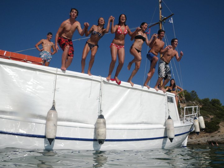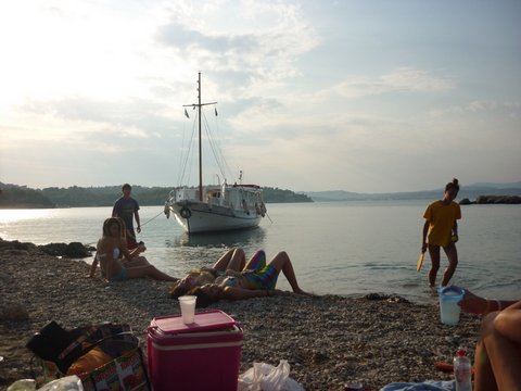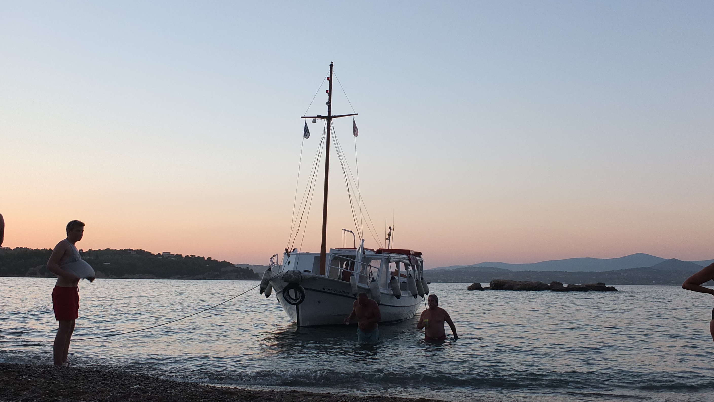 Every summer for the past 15 years or so, we have been lucky enough to return to Spetses. And every year we have been able to take a least one late afternoon boat trip out with friends to enjoy a beach a short ride away. Sometimes the trip has been around the island, stopping at 3-4 different places to swim along the way. Other times we gone to beaches on the mainland or just around to the other side of the island. Mostly its the weather that dictates where we go. But, weather permitting, the first choice with most is to go to Kounoupi, a little island about 20-30 minutes away by boat. Kounoupi means mosquitoin Greek, but the island’s name doesn’t refer to the amount of bugs, just its small size, which is tiny really, small enough to swim around if you are so inclined. But most friends aren’t. We just laze around on the small beach, taking frequent dips in the water and sharing food from the dozens of bags that get unloaded like a 747 on to the beach. Usually it around 5pm when we arrive and the sun is still warm but not scalding and its a much more comfortable time to be at the beach.